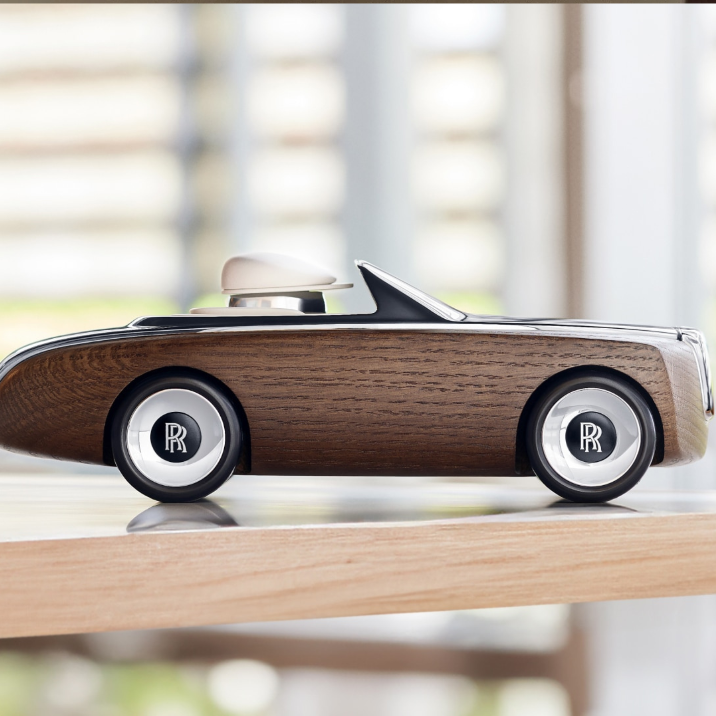 Crafted from solid wood and polished aluminium, the Rolls-Royce Cameo is designed to captivate and delight. Complete with self-levelling Rolls-Royce centre caps and its own distinguished driver, this charming model is a celebration of form and function.